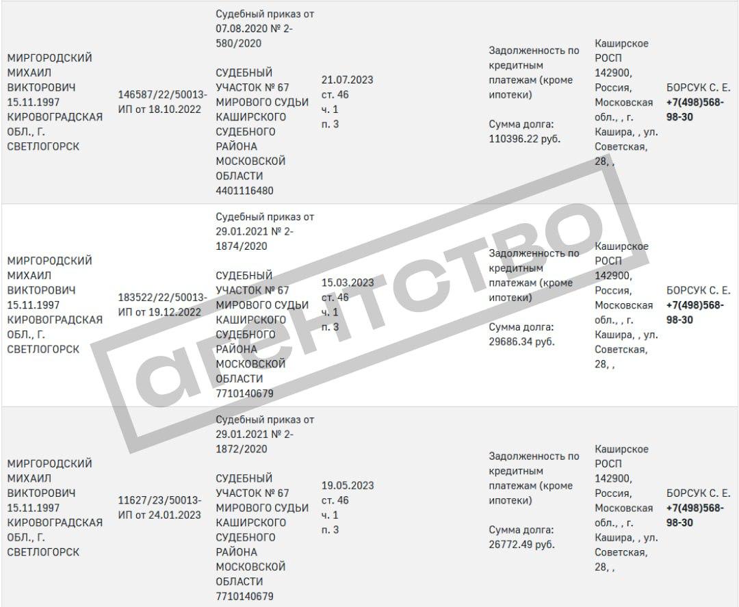 “Агентство” з’ясувало, що Миргородський народився в місті Світловодськ Кіровоградської області України, проте багато років проживав у Росії. Згідно з базою служби судових приставів, Миргородський має кредитні борги на 634 тисячі рублів.