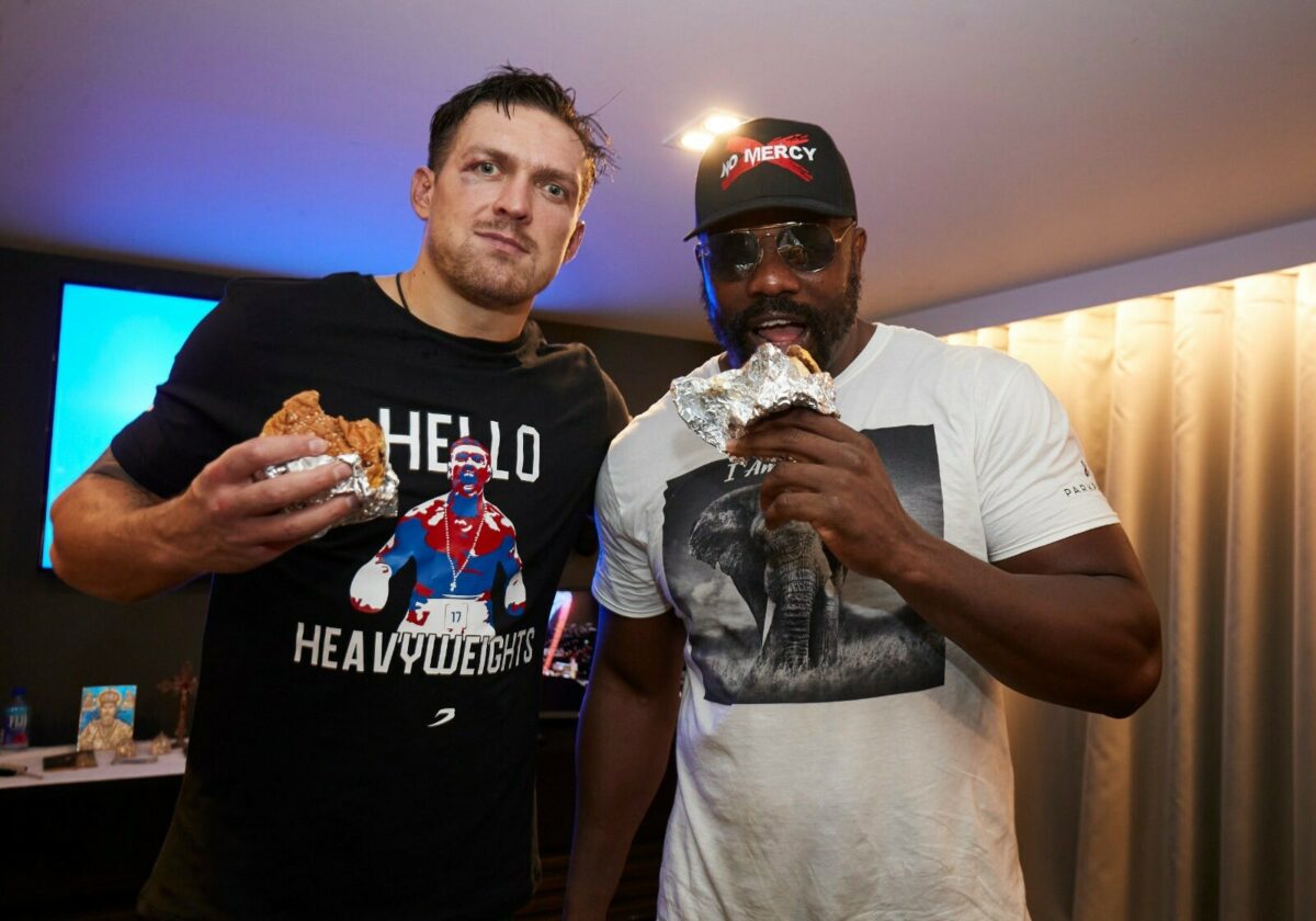 Британець зайшов після напруженого поєдинку до Усика в роздягальню, щоб пригостити його команду бургерами. На відео видно, як боксери спілкуються в теплій атмосфері, їдять бургери і фотографуються разом.