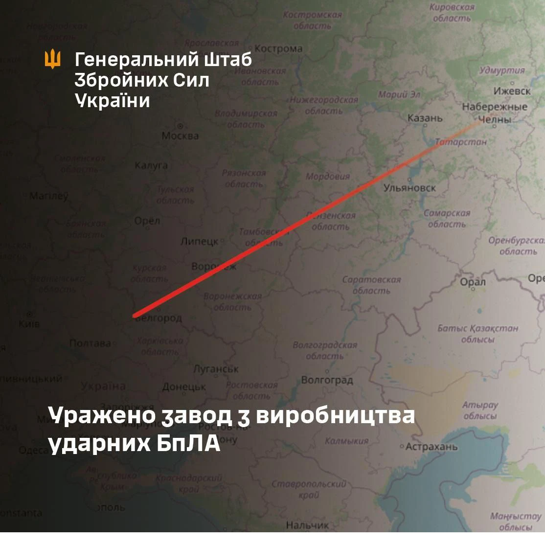 Як зазначили у Генштабі, виробнича потужність підприємства близько 300 різних БпЛА на добу. Знаходиться воно в Єлабузькому районі Республіки Татарстан (РФ) на відстані 1054 км від державного кордону України.