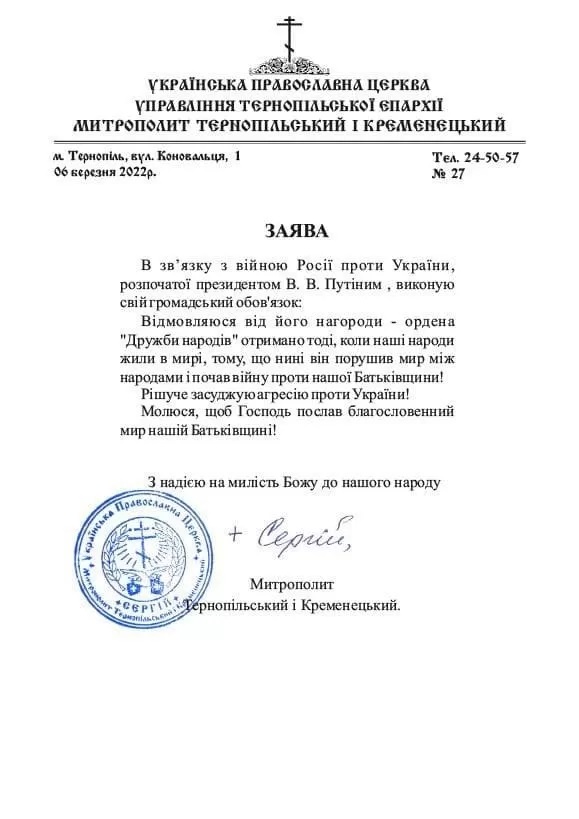 Частина єпископів незадоволені позицією Кирила. Тернопільський і Кременецький митрополит Сергій, на території якого знаходиться Почаївська лавра, оприлюднив заяву із засудженням війни Росії і Путіна проти України і відмовився від його нагороди.