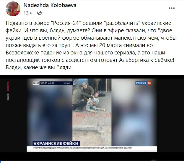 Пропагандисти російського федерального телеканалу “Росія – 24” відзначилися черговим фейком-відео зі зйомок російського серіалу показували як те, що відбувається в Україні. Про це у Facebook повідомила Надія Колобаєва, причетна до зйомок серіалу.