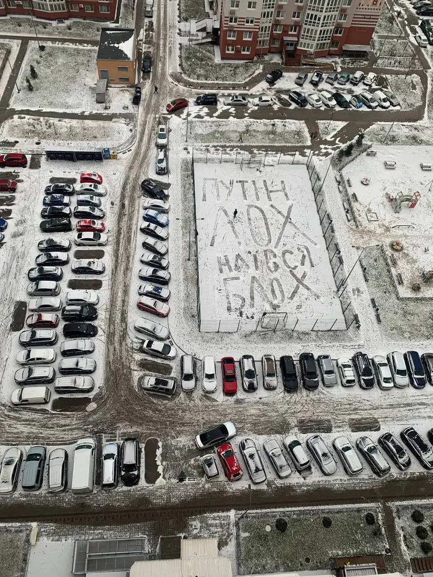 На засніженому спортивному майданчику діти витоптали напис: “Путін лох, наївся бліх”.