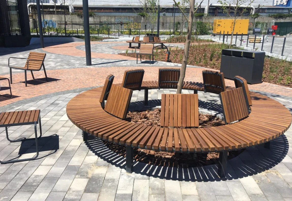 У маленьких дворах часто є складно доступні або непрямолінійні зони, де важко розташувати стандартні лави. Радіальні конструкції можуть «обійняти» існуючий об’єкт – наприклад, стовбур дерева або клумбу, перетворюючи цю ділянку на зручне місце для відпочинку. Такий підхід не лише економить простір, а й додає йому природної привабливості, адже люди можуть сидіти в тіні крони або насолоджуватися квітучими рослинами.