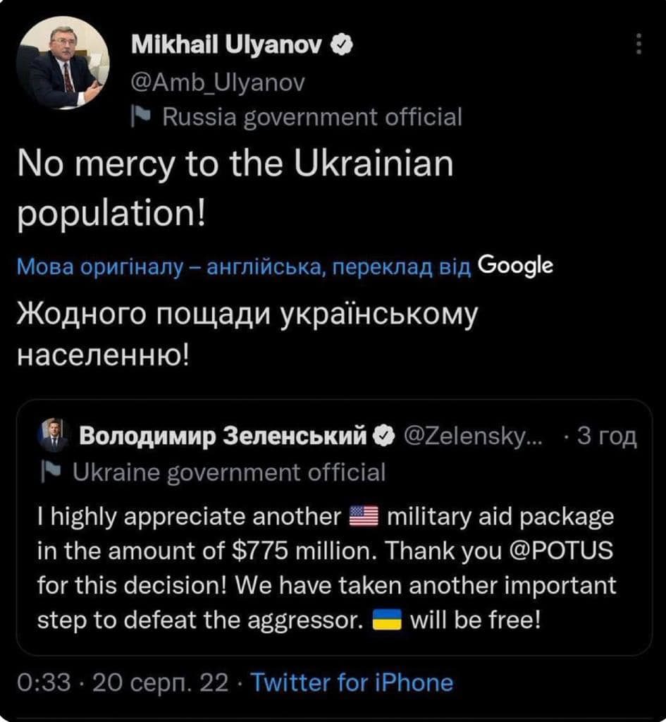 Постійний представник РФ при міжнародних організаціях у Відні (Австрія) Михайло Ульянов написав у Twitter повідомлення із закликом не жаліти українське населення. Пізніше він видалив свій пост.