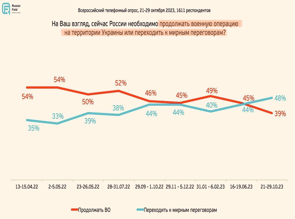 ✔️Опитування на картинці демонструє, що і в Росії крига скресла – охочих переходити до мирних переговорів уперше стало більше, ніж воювателів до переможного кінця.