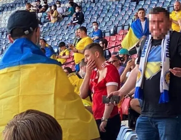 Чоловік у шапці-вушанці з радянською символікою і у формі збірної Росії спочатку обіймався з одним з українських фанатів. Фотофакт швидко підхопили російські пропагандистські ЗМІ, вказуючи на дружбу двох народів, пише champion.com.ua.
