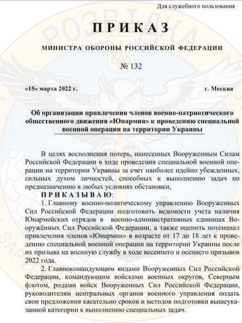 Зазначається, що Шойгу підписав указ «Про організацію залучення членів військово-патріотичного громадського руху “Юнармія” до проведення спеціальної операції на території України».