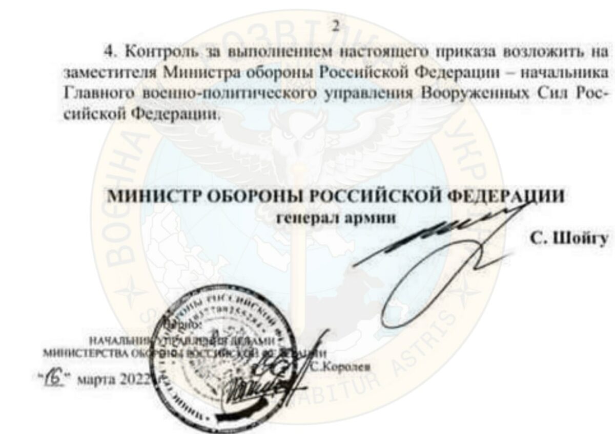 Вище військове керівництво Росії має надати пропозиції щодо проведення підготовки зазначеного особового складу в найкоротші терміни. Вказується, що контроль за виконанням наказу проводитиме начальник Головного військово-політичного управління ЗС РФ Геннадій Жидко.