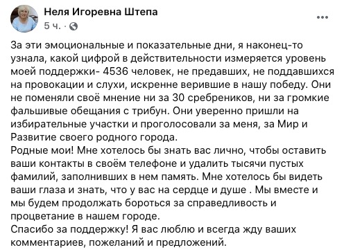 “За ці емоційні і показові дні, я нарешті дізналася, якою цифрою насправді вимірюється рівень моєї підтримки – 4536 осіб, які не зрадили, не піддалися на провокації і чутки, щиро вірили в нашу перемогу. Вони не поміняли свою думку ні за 30 срібняків, ні за гучні фальшиві обіцянки з трибун. Вони впевнено прийшли на виборчі дільниці і проголосували за мене, за Мир і розвиток свого рідного міста”, – написала політик.