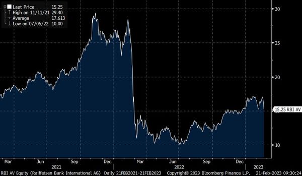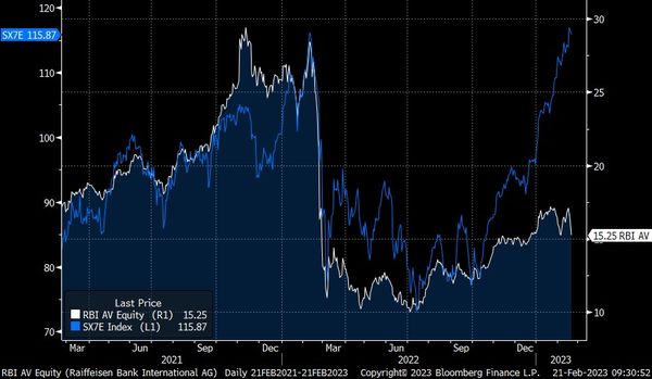 Що отримав банк в результаті. З одного боку, рекордні прибутки на російському ринку. Які складають більше половини прибутків цієї групи. З іншого боку, акціонери не дуже щасливі з того приводу. Подивіться на графіки. Рік тому, коли почалася війна, вартість акцій всіх європейських банків пішла різко вниз. Але індекс вартості банківських акцій показує, що інші фінансові установи відновили свою капіталізацію за останній рік. Але тільки не Райффайзенбанк. Якому додатково зараз прилетіло від американців, які будуть вивчати, чи не заслуговує банк на санкції.