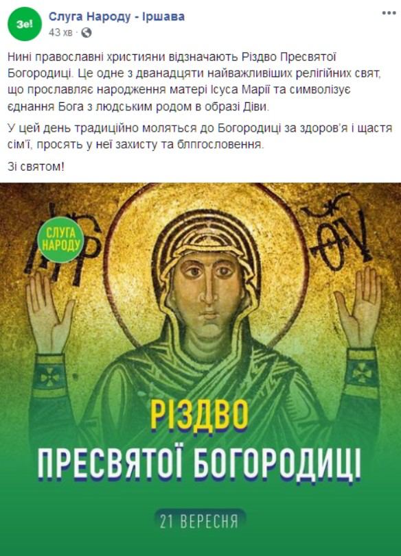Осередок партії “Слуга народу” на Закарпатті привітав у Мережі своїх виборців з Різдвом Пресвятої Богородиці, прикріпивши до посту зображення Ікони Богоматері з логотипом політичної сили.
