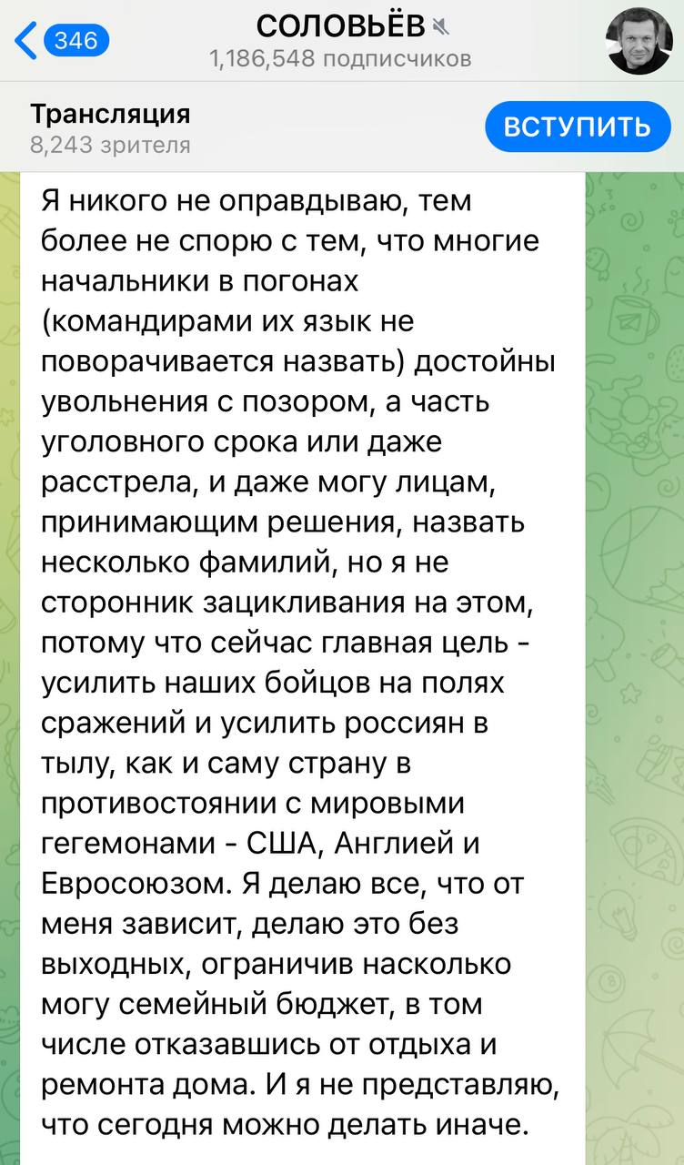 “Я нікого не виправдовую, тим більше не сперечаюся з тим, що багато начальників у погонах (командирами їх язик не повертається назвати) гідні звільнення з ганьбою, а частина кримінального строку або навіть розстрілу, і навіть можу особам, які приймають рішення, назвати кілька прізвищ ….”, – написав пропагандист.