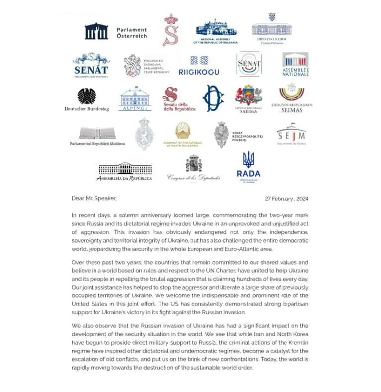 Спікери 23 парламентів і глава Європарламенту Роберта Мецола направили відкритого листа спікеру Палати представників Конгресу США Майку Джонсону з проханням внести на розгляд законопроєкт про виділення $60 млрд допомоги для України. Про це повідомляє голова Верховної Ради Руслан Стефанчук.
