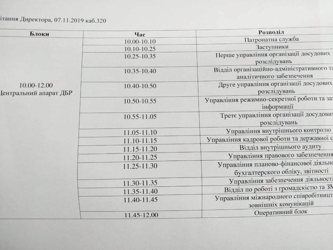Судячи по фотографії документа, в ньому чітко вказані години привітання Труби для кожного з відділів ДБР. Так, центральний апарат бюро повинен вітати свого директора з 10 до 12:00, при цьому саме привітання повинно займати не довше 5 хвилин.