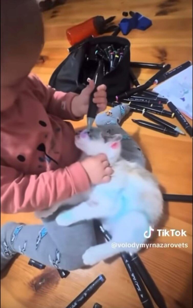 У мережі раніше з’явилося відео, на якому маленька дівчинка розфарбовує кота фломастерами. За кадром жіночий голос сварить дитину та забирає тварину. Інцидент викликав значний суспільний резонанс, а зоозахисники звернулися до поліції з вимогою перевірити стан тварини та притягнути дорослих до відповідальності.