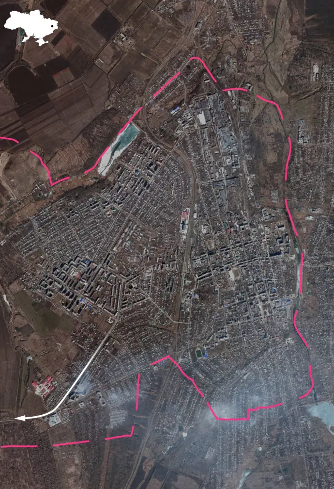 На фото, зробленому 6 березня, видно, що зруйновано мости через річку Бахмутівка, яка ділить місто навпіл і, як зазначає NYT, може бути використана ЗСУ для стримування ворога.