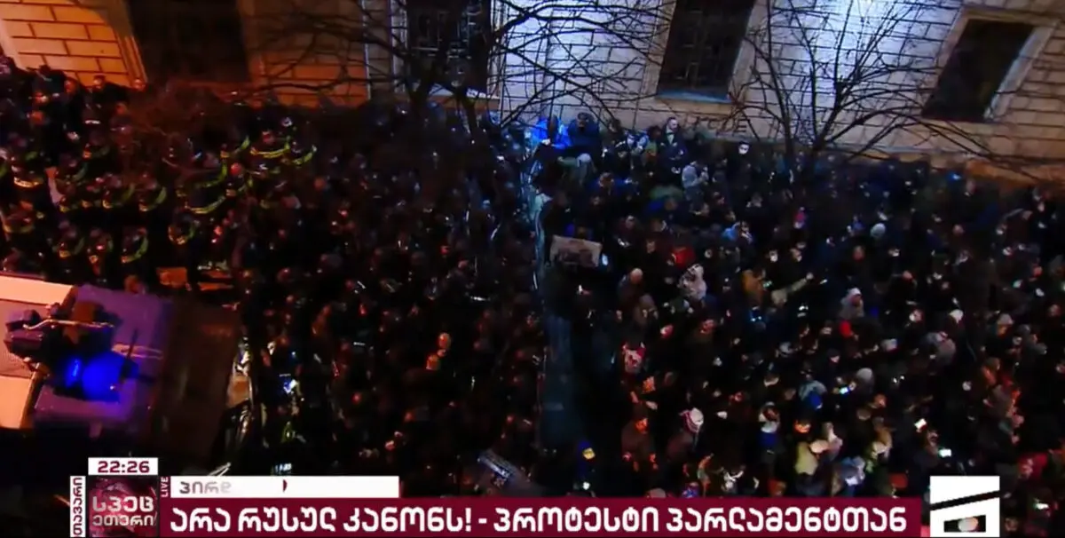 Проспект Руставелі у Тбілісі перекрили, оскільки перед будинком парламенту проходить акція протесту. Кількість учасників збільшилася після того, як на пленарному засіданні розпочалися слухання проектів закону про «іноагентів».