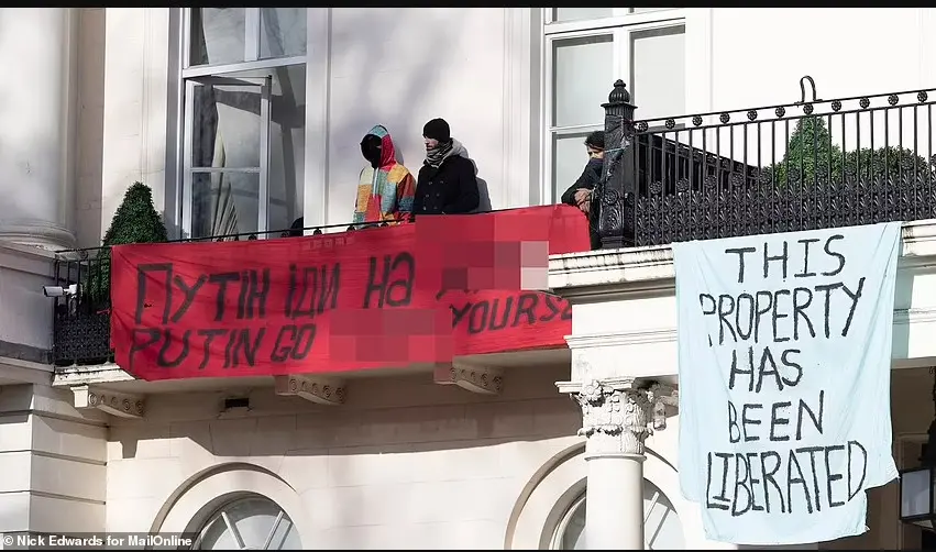 Активісти увірвалися в будинок в елітному лондонському районі Белгравія після півночі в понеділок, 14 березня. Вони вивісили прапори України і транспаранти з написом: “Це майно звільнено” і “Путін, йди на х*й”.