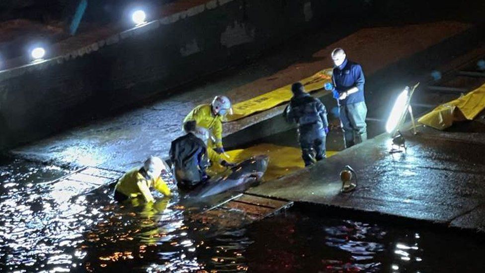 Представники рятувальних служб прибули на місце події о 21:00. Через чотири години кита, довжиною близько 4 метрів, вдалося транспортувати в безпечне місце.