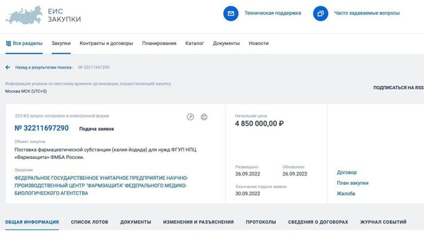 У Росії терміново закуповують йодид калію, який застосовується захисту від викидів радіоактивних речовин. Відповідний тендер з’явився на сайті держзакупівель РФ.