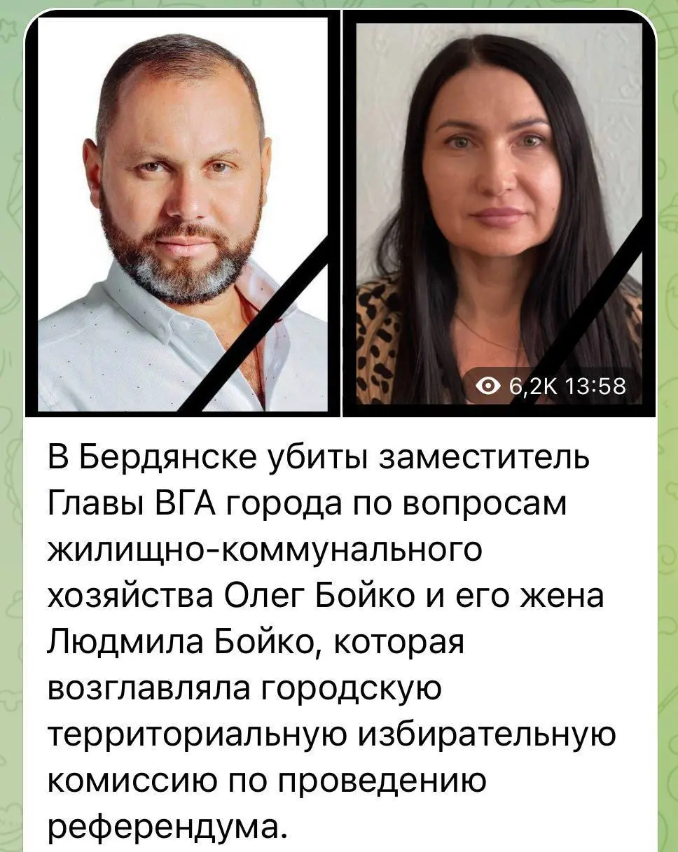 В окупованому Бердянську вбили заступника так званого «мера» Олега Бойко та його дружину. Про це повідомляє місцевий Telegram-канал «Бердянск Сейчас».