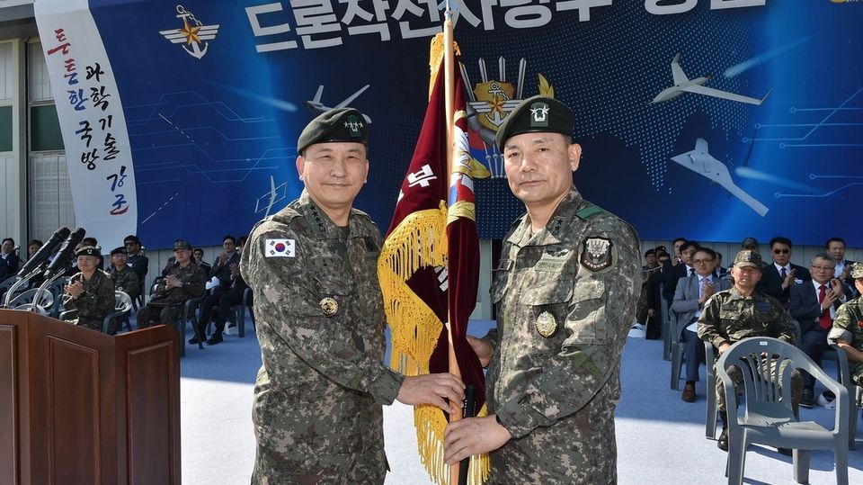На фото: командувач збройних сил Південної Кореї генерал Кім Сонг-кюм вручає прапор знов створеного Оперативного командування дронів генералу Лі Бо-Хюнгу.