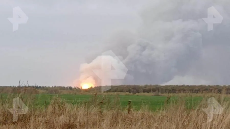 Telegram-канал Mash оприлюднив відео з місця подій. На кадрах видно, як чорний густий дим затягнув небо. Місцеві жителі стверджують, що чули вибухи боєприпасів. Вони детонують вже кілька годин.