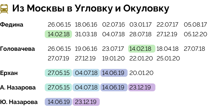 Видання вивчило базу даних, яка утекла, про бронювання залізничних квитків і виявило, що п’ять “подруг” Кабаєвої, які постійно її супроводжують, часто їздять на Валдай.