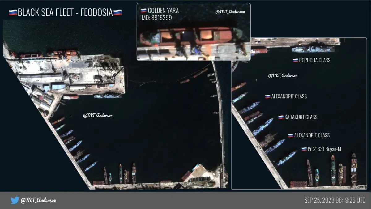 Зі знімку випливає, що на 25 вересня 2023 року в порту Феодосії знаходилися відразу два кораблі-носія крилатих ракет “Калібр”: один корвет проєкту 21631 “Буян-М” та один корвет проєкту 22800 “Каракурт”.