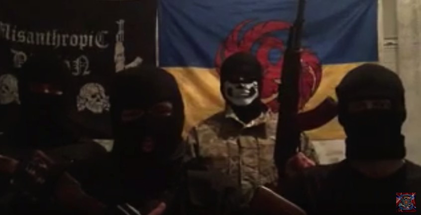 На фоне висит флаг украинской «военно-патриотической» организации Misanthropic Division, которая, в частности, 14 октября участвовала в факельном шествии по Киеву.