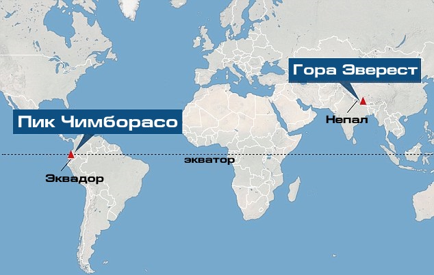 Сообщается, что вершина Чимборасо достигает высоты в 3967 миль (6384 километров), если считать от центра Земли. Эверест оказался на высоте 3965 миль (6381 километров).