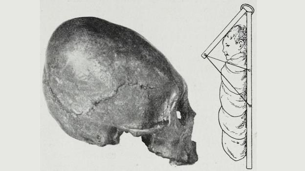 Черепу человека можно задать разную форму, но только в раннем детстве, вскоре после рождения. Один из способов — плотно связать его голову полосами ткани. Это заставляет череп вытягиваться и придает голове цилиндрическую форму, пишет ВВС.