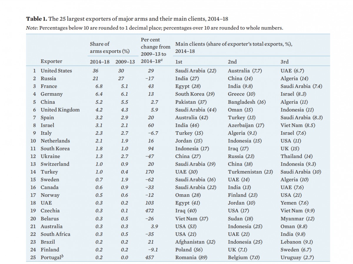 В 2018 году Украина занимала 11 место в списке экспортеров оружия, а ее клиенты оставались те же. В SIPRI подчеркнули, что согласно информации украинских журналистов, Россия остается основным импортером оружия из Украины, несмотря на запрет торговли со страной-агрессором.
