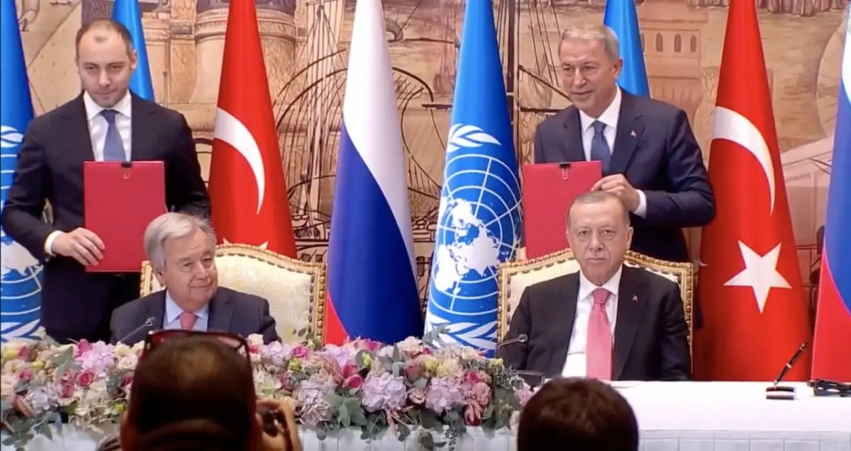 Министр инфраструктуры Украины Александр Кубраков, министр обороны Турции Хулуси Акар и генсек ООН Антониу Гутерреш подписали соглашение о вывозе зерна из украинских портов. Об этом стало известно во время церемонии подписания договора.