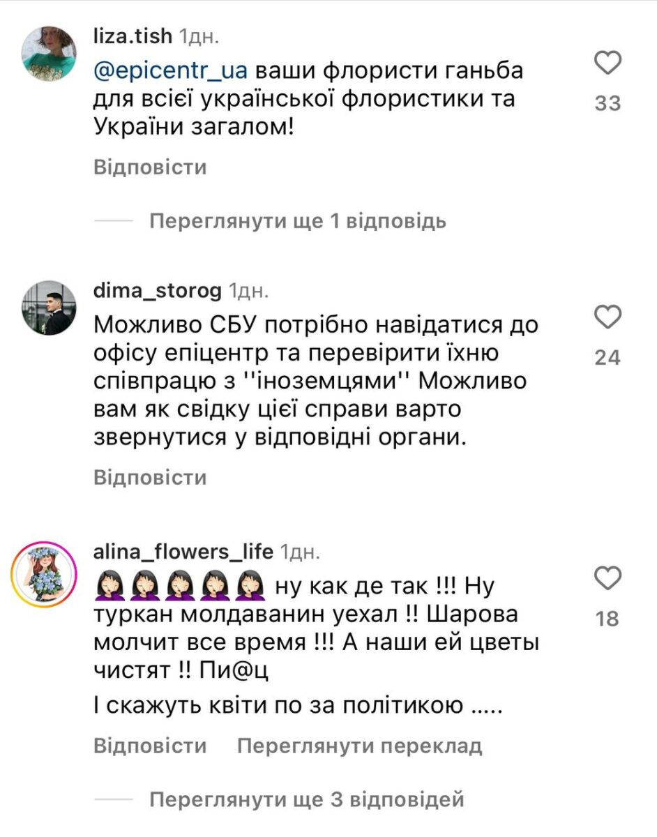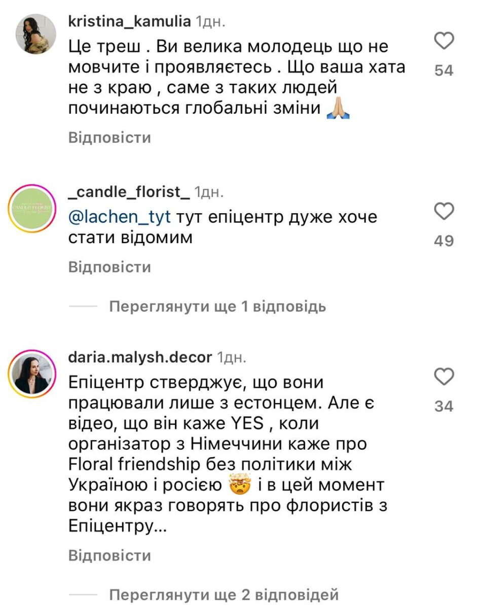 Представитель Департамента по связям с общественностью компании «Эпицентр» Елена Коваленко прокомментировала ситуацию и отметила, что соглашается, что «организаторы вели себя некорректно и недопустимо, заявляя о флористической дружбе между Украиной и РФ».