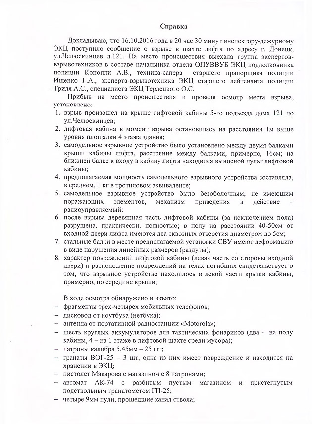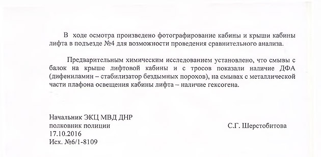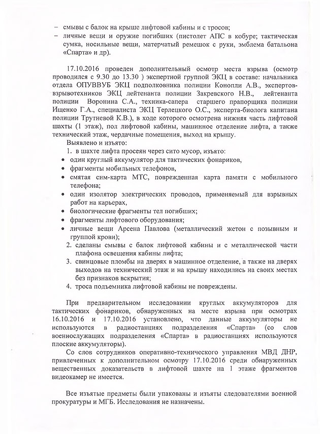 Наряду с этим, в документе детально расписывается, где именно случился взрыв и какие химические вещества (гексоген) были обнаружены на месте взрыва. В том числе, указывается на найденный на следующий день после взрыва «изолятор электрических проводов, который применяется для подрывных работ на карьерах».
