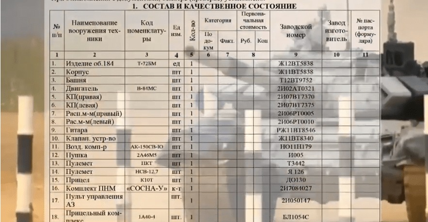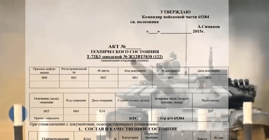 В сюжете продемонстрирован Акт технического состояния танка Т-72Б3, заводской номер №Ж12ВТ5838 (122). Танк, согласно документу относится к воинской части Вооруженных сил Российской Федерации 65384. Согласно открытым данным, это 17-я мотострелковая бригада, которая дислоцируется на территории Чеченской республики в м.Шали. Согласно открытым данным, бригада имела на вооружении 41 танк модификации Т-72Б3. А украинские аналитики из InformNapalm их идентифицировали среди оккупационных войск из фотодоказательств о пребывании в Донбассе танкиста 17 бригады Максима Иванова, который затем был награжден орденом «За отвагу!»