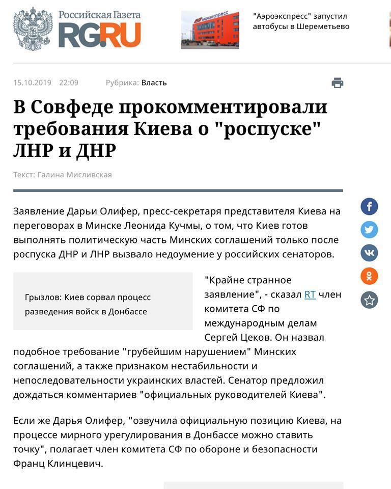 В России по этому поводу уже истерика. Как обычно, обвиняют Украину в срыве переговоров, но на самом деле все сказано верно: в самих минских соглашениях нет никаких «ЛДНР». Есть отдельные районы Донецкой и Луганской областей — ОРДЛО. Следовательно, нарушением минских соглашений является как раз сам факт существования так называемых «республик».