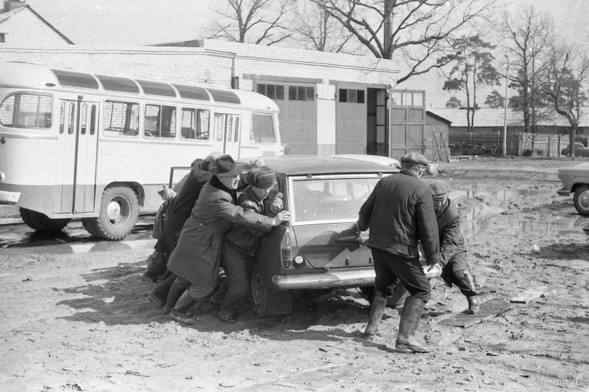 Или такие. Тут дядьки стараются вытолкать из грязи наглухо завязший там «Москвич-2137», причем обратите внимание, что дело происходит не в каком-то там лесу, а где-то вроде колхозной ремонтно-технической базы. Дядька в шляпе — вероятно какой-то местный начальник.