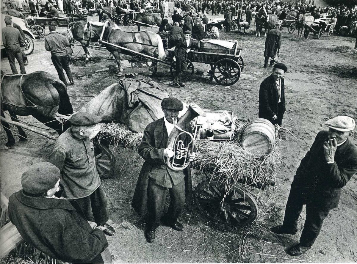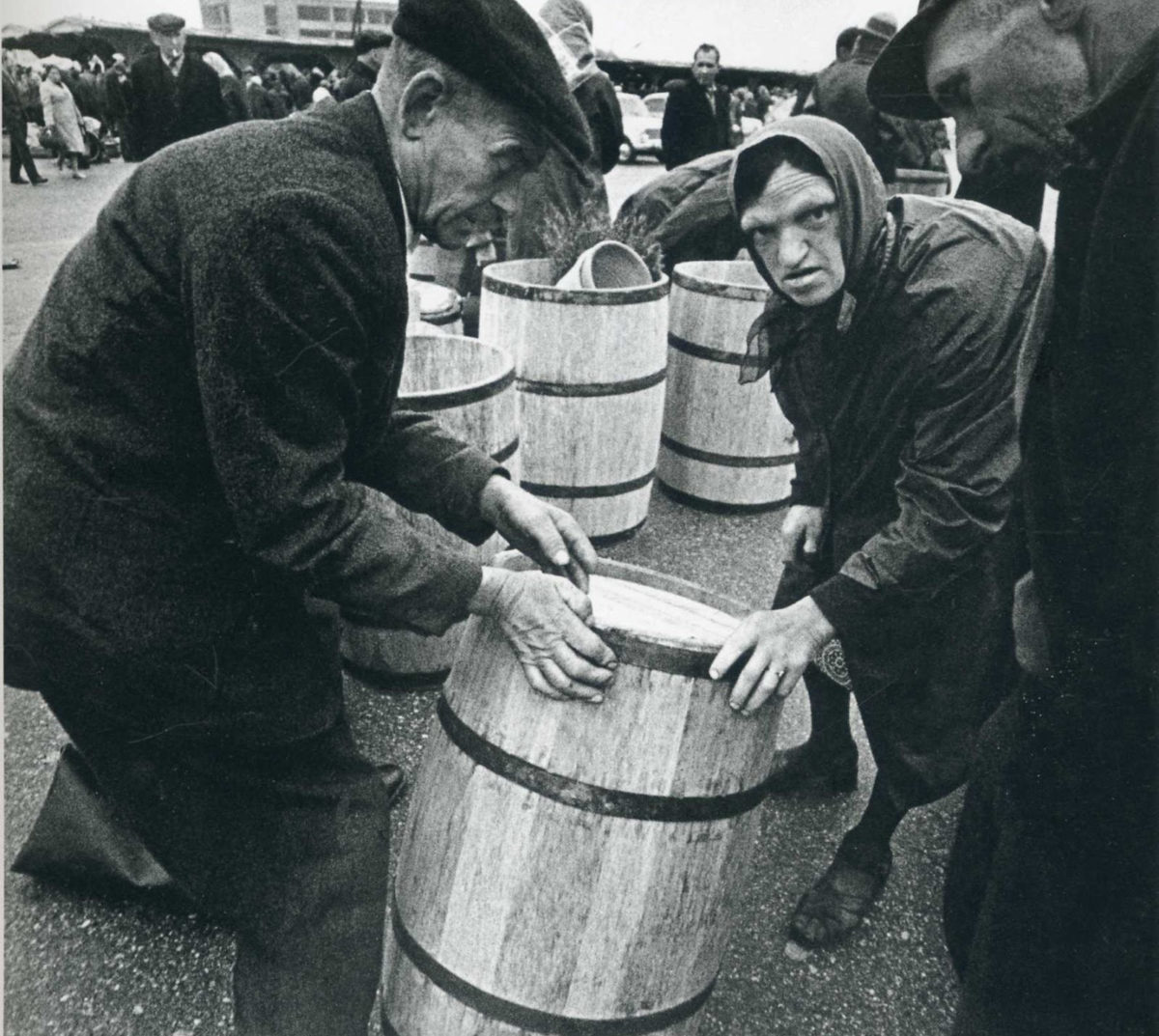 Или вот, тоже советский рынок, покупатели бочки. Снимок словно из XIX века, а персонажи — как с полотен Брейгеля, а между тем — это семидесятые годы, брежневская эпоха.