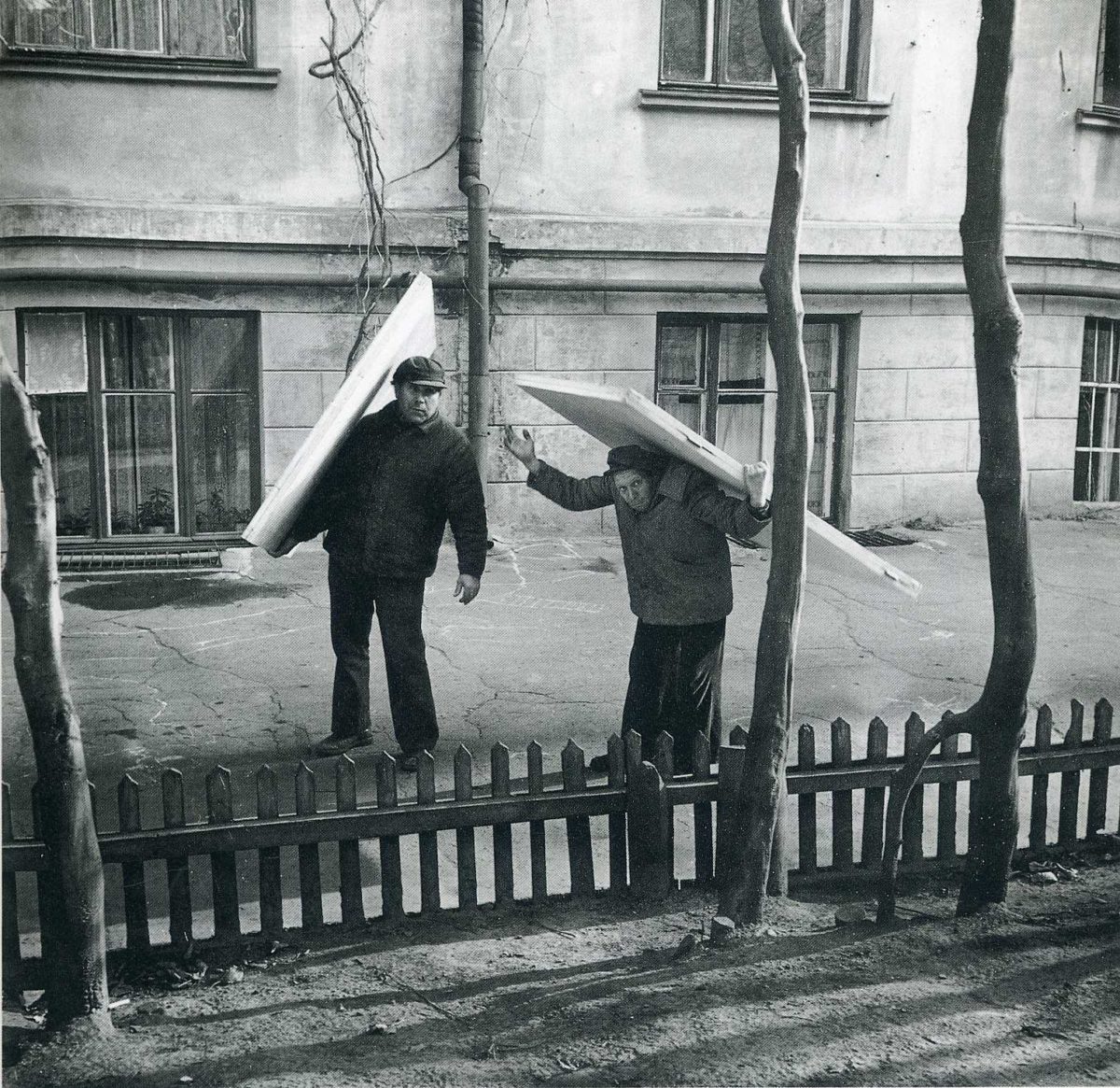 Разумеется, никаких «служб доставки» или чего-то такого в советской провинции не существовало — если в больших городах ещё было так называемое «грузовое такси» (в котором часто работали жулики, сколачивающие на этой работе состояние), то в провинции не было вообще ничего. Чтобы отвезти груз, приходилось договариваться с шофёром Лешей/ механизатором Колей/ тракторисом Валерой за бутылку либо за деньги. Иногда приходилось обходиться и своими средствами — люди на фото ниже тащат на себе двери.