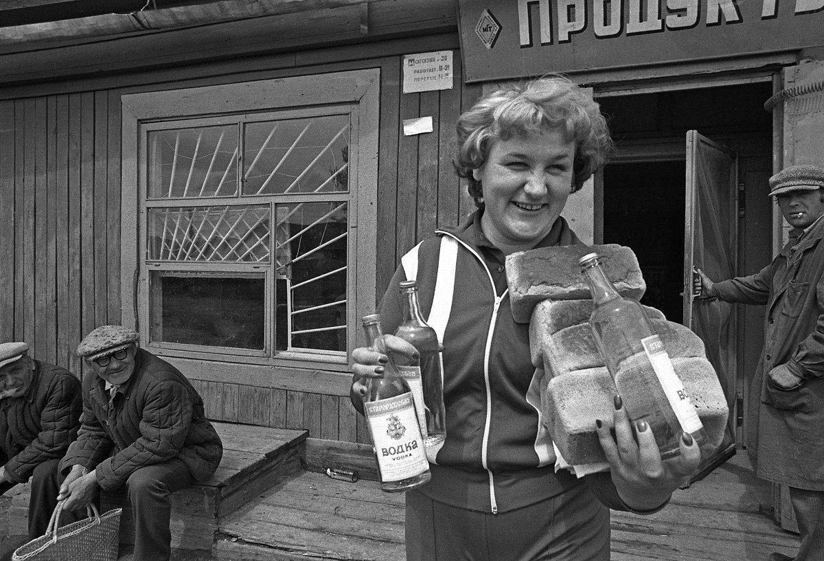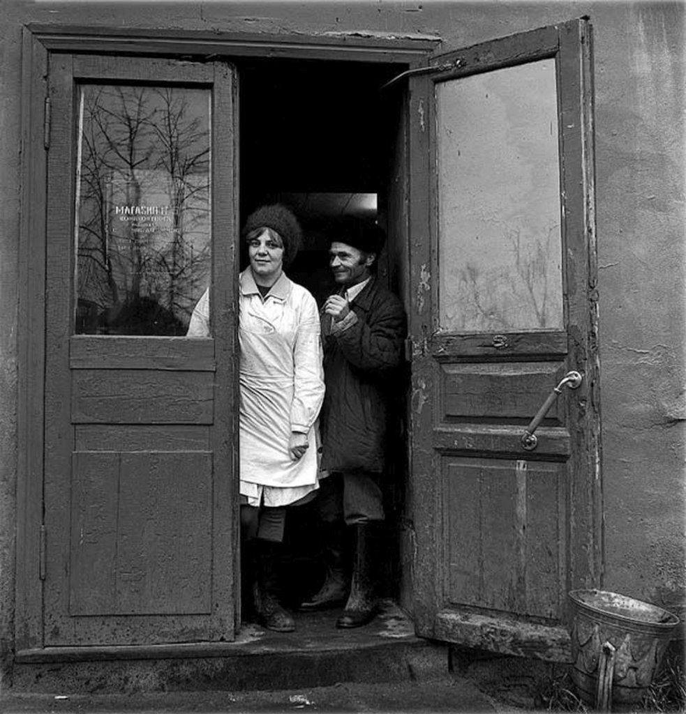Вот тоже такой типичный провинциальный советский магазин. Сверху висит вывеска «Продукты», опционально там ещё могло быть написано что-то вроде «Магазин №14 Райпищепрома». Женщина выходит из дверей, отоварившись тем самым кислым хлебом «кирпич» и тремя бутылками водки… Женщина, кстати, весьма по местным меркам зажиточная — с маникюром и какой-никакой прической, в модной мастерке на молнии. Сильно контрастирует с местным окружением, одетым в ватники.