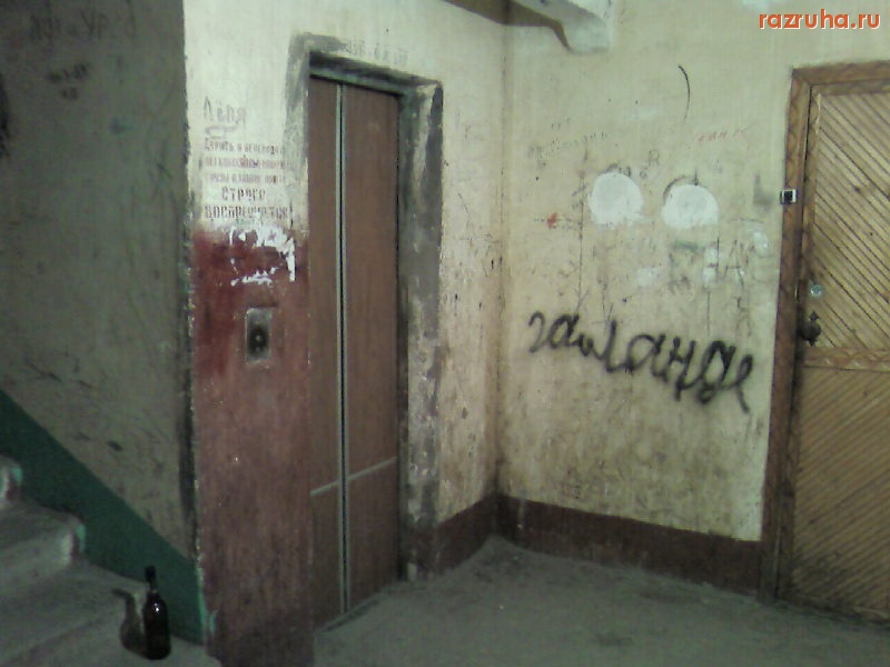 Если в доме более пяти этажей, то поднявшись по лестнице повыше — вы увидите лифт. Лифт в загаженном подъезде будет выглядеть примерно вот так — облупленные стены вокруг дверей, остатки каких-то объявлений, погнутые неведомой страшной силой алюминиевые накладки и сожжённые зажигалкой кнопки вызова лифта и этажей. Одно время кноки пытались делать антивандальными — алюминиевыми, но такая пиндосская хитрость не останавливала деятельную натуру лифтовых вандалов — и они в порядке сатисфакции сжигали кнопки «стоп» и «вызов диспетчера»: