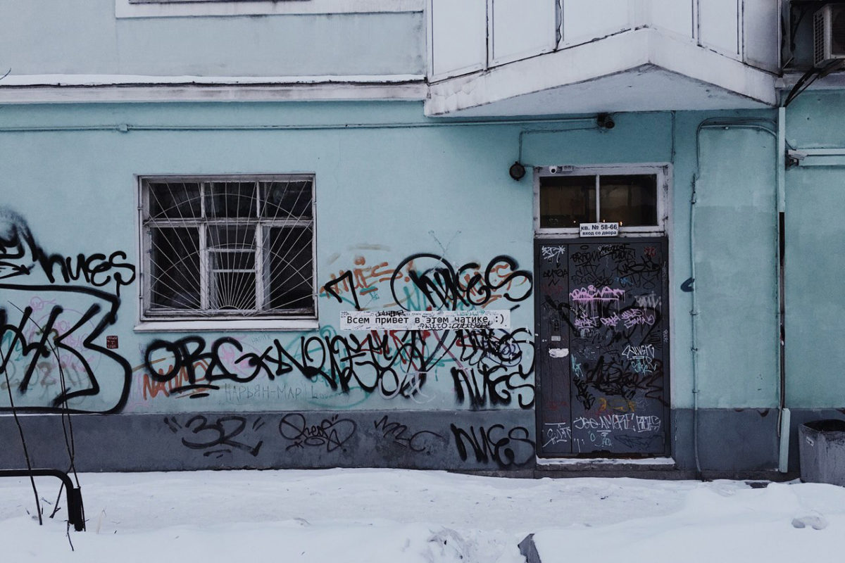 Для начала давайте посмотрим, как выглядят входные группы в те самые подъезды. Типичный вход в российский подъезд выглядит примерно так, как вот на этом фотоснимке, сделанном Сашей Беленьким macos. Тяжёлая грубо сваренная металлическая дверь, часто без ока и малейшего намёка на стекло (что само по себе выглядит очень депрессивно). Дверь чаще всего обклеена десятками объявлений вроде «деньги в долг куплю квартиру», причём объявления часто клеятся на дверь даже в случае наличия доски объявлений.