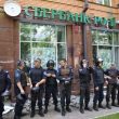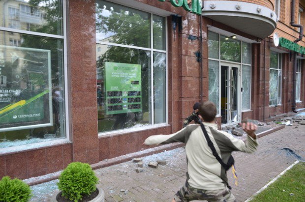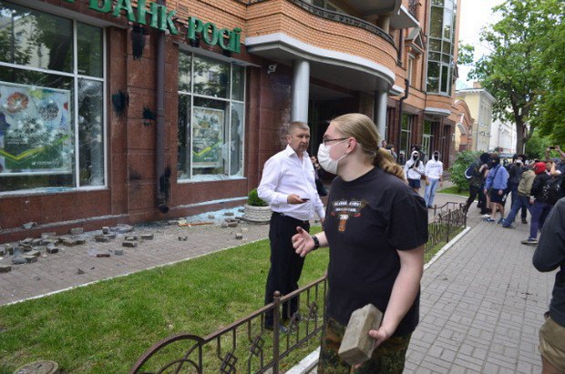 Люди в балаклавах разбили окна брусчаткой и выбили двери банковского офиса. Однако внутрь толпа не заходила и отделение не грабила.