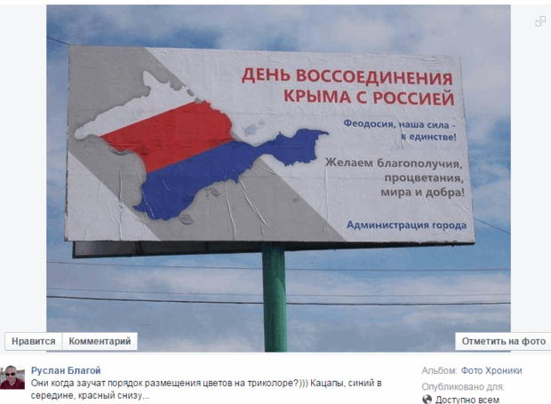 Позже власти Феодосии открестились от билбордов с изображением Крыма, на котором перепутаны цвета российского флага. Скандальные плакаты обещают снять, и уверяют, что из бюджета они не оплачивались.