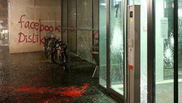 Нападавшие также оставили надпись «Facebook Dislike» на здании офиса социальной сети. В результате нападения был причинен ущерб стенам, парадной двери и окнам офиса.
