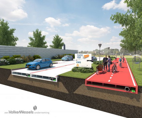 Компания KWS Infra (Нидерланді) разработала проект пластиковых дорог PlasticRoad. По задумке, их строительство будет дешевле и быстрее обычных, а само дорожное полотно будет дольше служить.