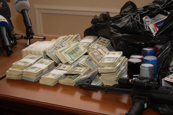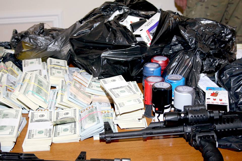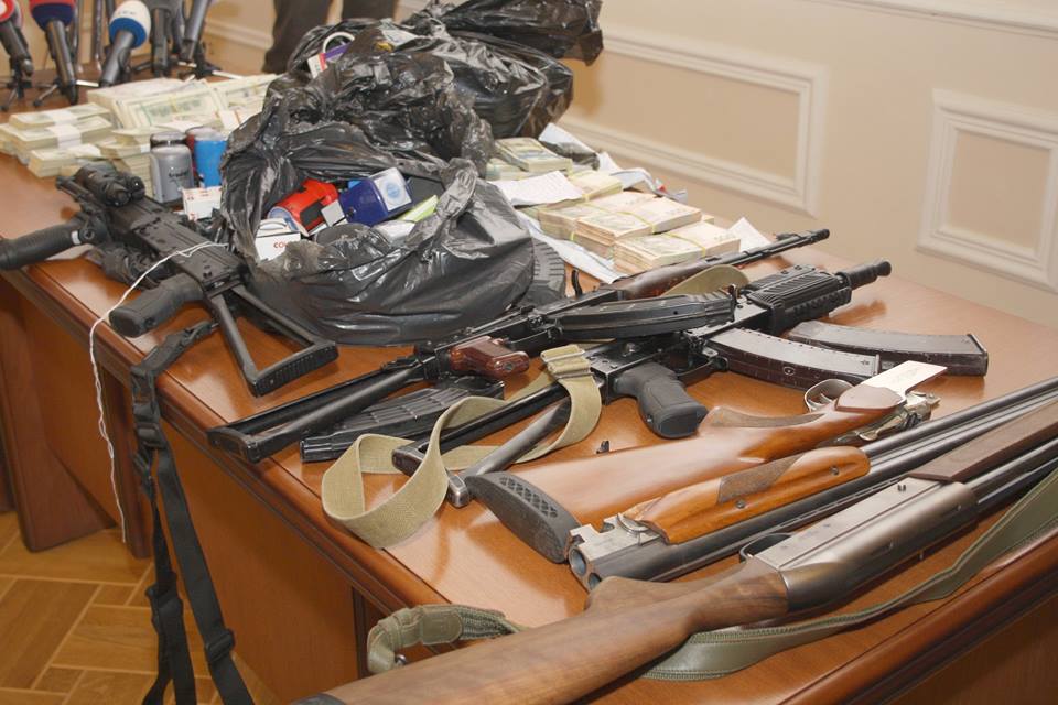 Прокурор продемонстрировал оружие, деньги (в гривнах и в иностранной валюте), а также более 200 печатей разных фирм.