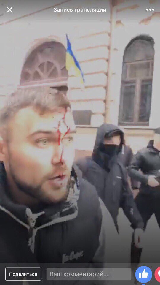 «Мы сидели, блокировали, неожиданно появилось человек 50-60 полицейских, начали нас оттеснять, избивать», — сказал журналистам представитель «Национального корпуса» Антон Цебро.